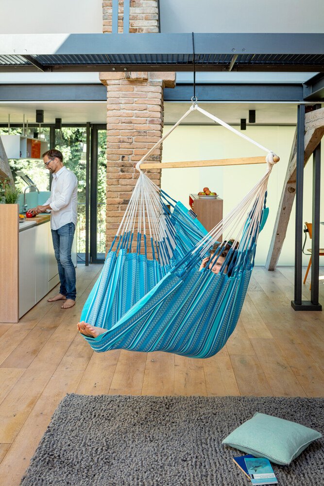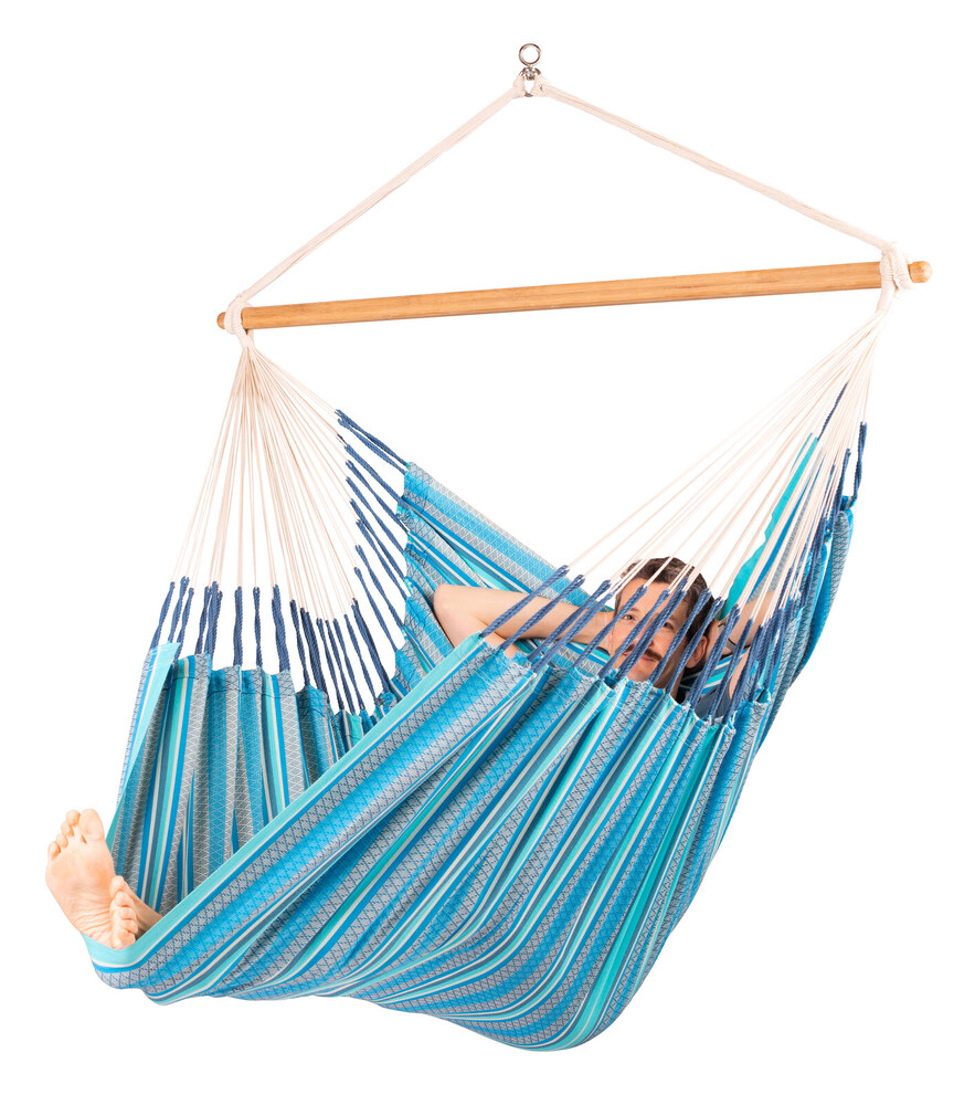 A Habana Azure függőfotel fantasztikusan kényelmes és tágas, organikus pamut anyagból készült - a súlytalanság érzetét biztosítja. A függőfotel hatalmas méretének köszönhetően nem csupán ülve kényelmes, de fekve is nagyszerűen használható. Anyaga lágy tapintású, puha organikus pamut, ugyanakkor igen könnyen tisztítható. A Habana függőfotel GOTS tanúsítvánnyal rendelkezik, így garantáltan környezetbarát és egészségre ártalmatlan anyagokkal kezelt alapanyagokból készült. A nagyszámú zsinórzat a kolumbiai függőszékek általános jellemzője. A súlyeloszlás használat közben optimális a függőfotel a zsinóroknak köszönhetően maximális kényelmet nyújt, miközben igen strapabíró. A textil megerősített szélei nagy szakítószilárdságot biztosítanak a függőfotelnek. A beépített biztonsági forgószem biztonságos 360 fokos elforgást tesz lehetővé. A távtartó rúd csúcsminőségű bambuszból készült, amely nem csak vonzó küllemű, de rendkívül erős és vízálló. Emellett az sem elhanyagolható, hogy a függőágy fa alkotóelemei felelős erdőgazdálkodásból származnak(FSC®).